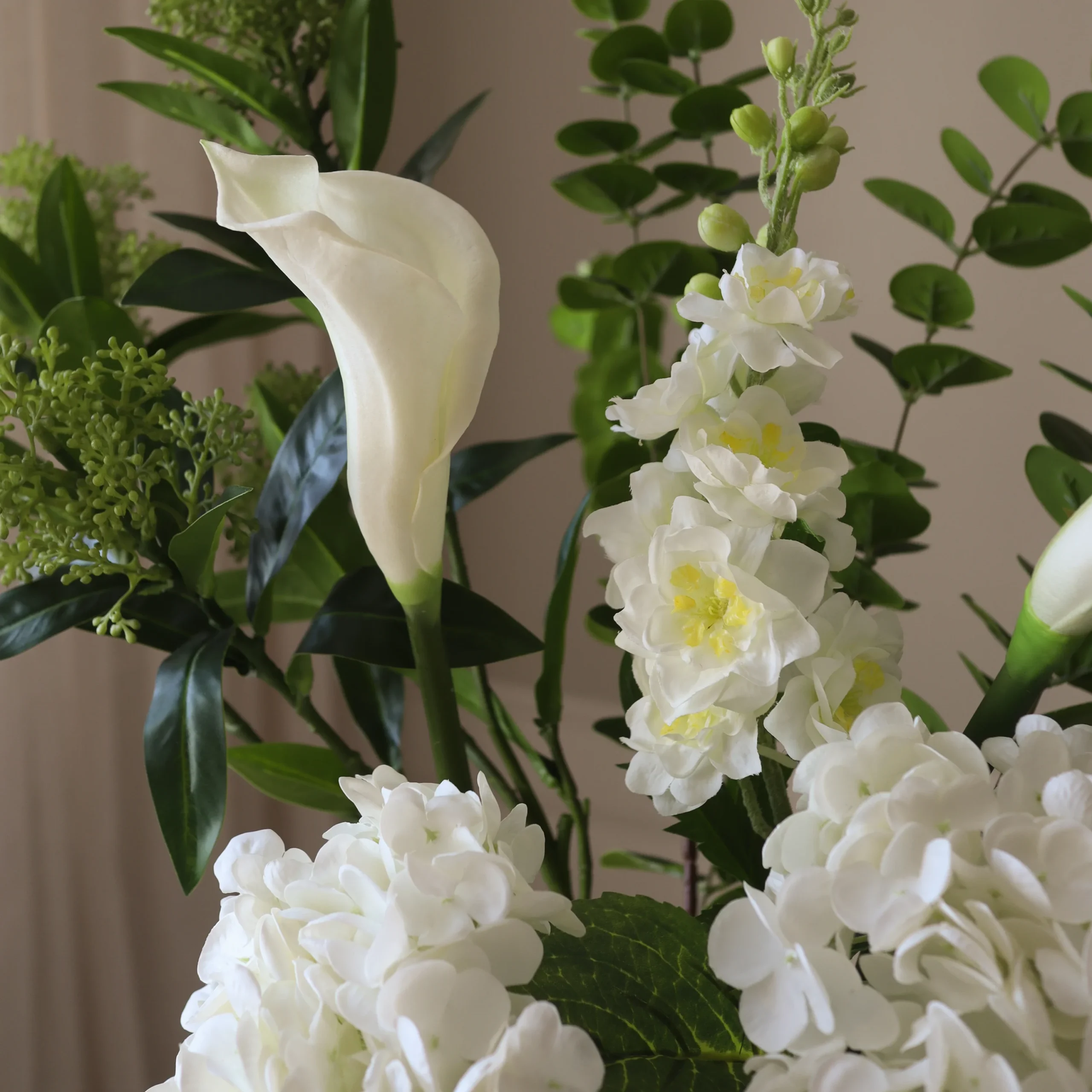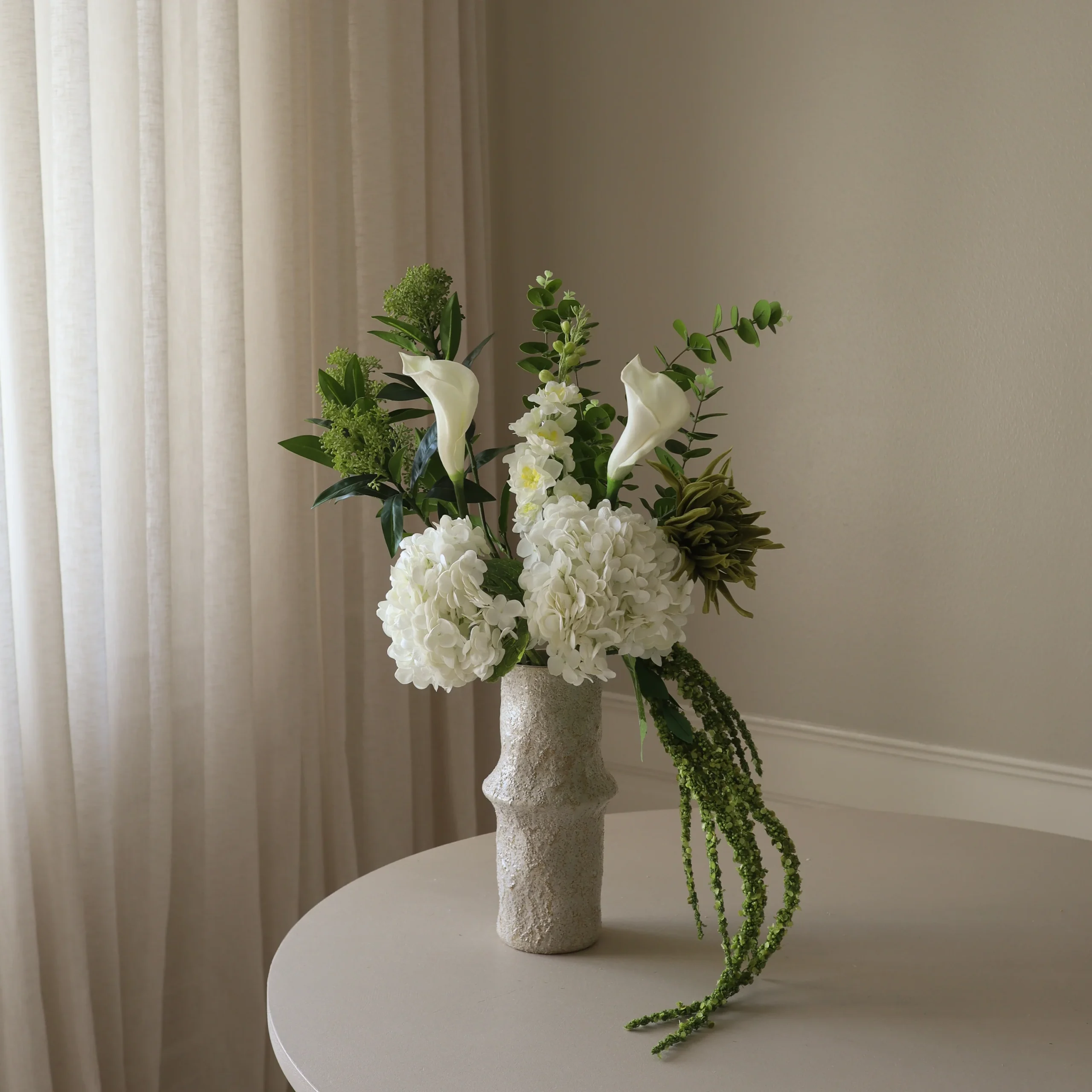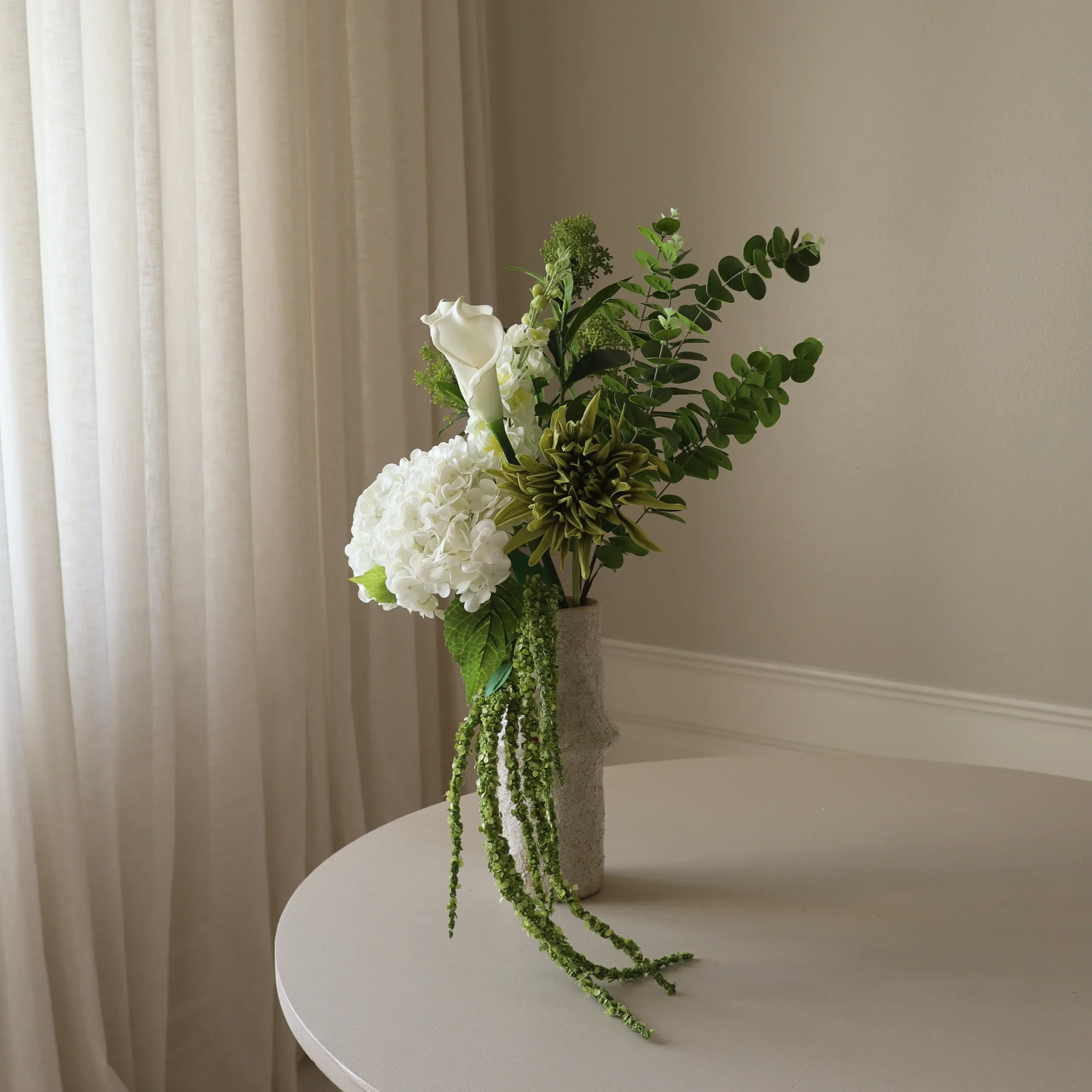 This bouquet showcases a mix of soft white and deep green tones, combining structured petals with cascading elements for a naturally flowing display. The textured blossoms and trailing stems create a layered and organic composition, evoking the lush beauty of a forest setting.